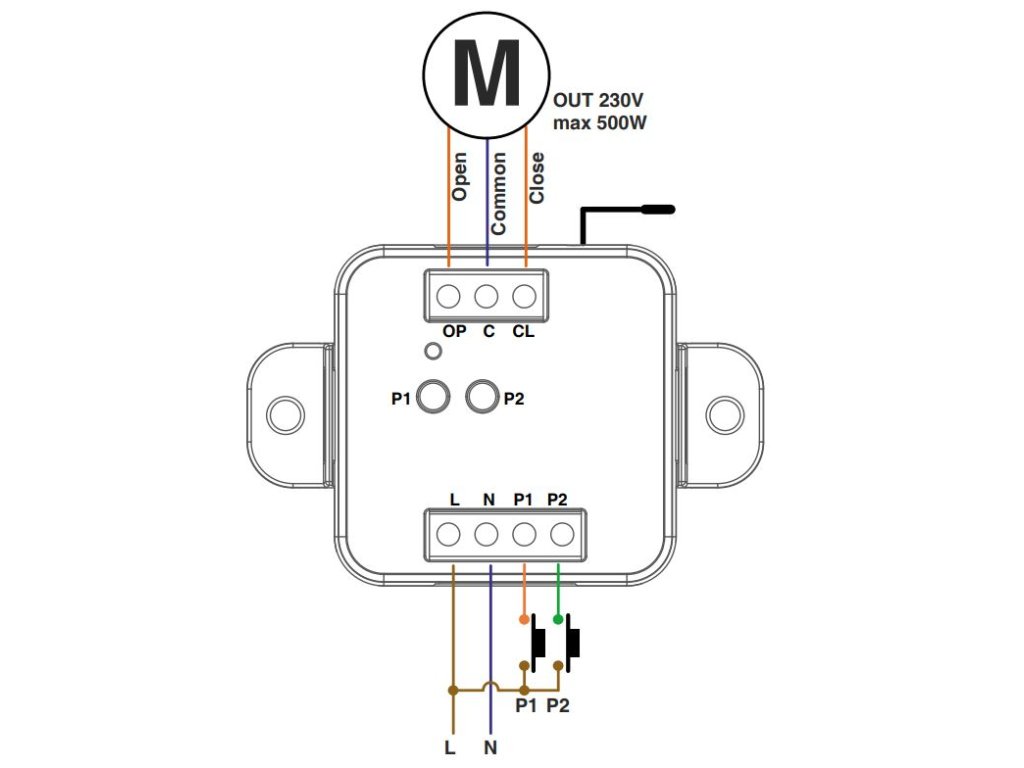 Modul (řídicí jednotka) pro ovládání 230V AC pohonů rádiovým ovládáním nebo drátovým tlačítkem.